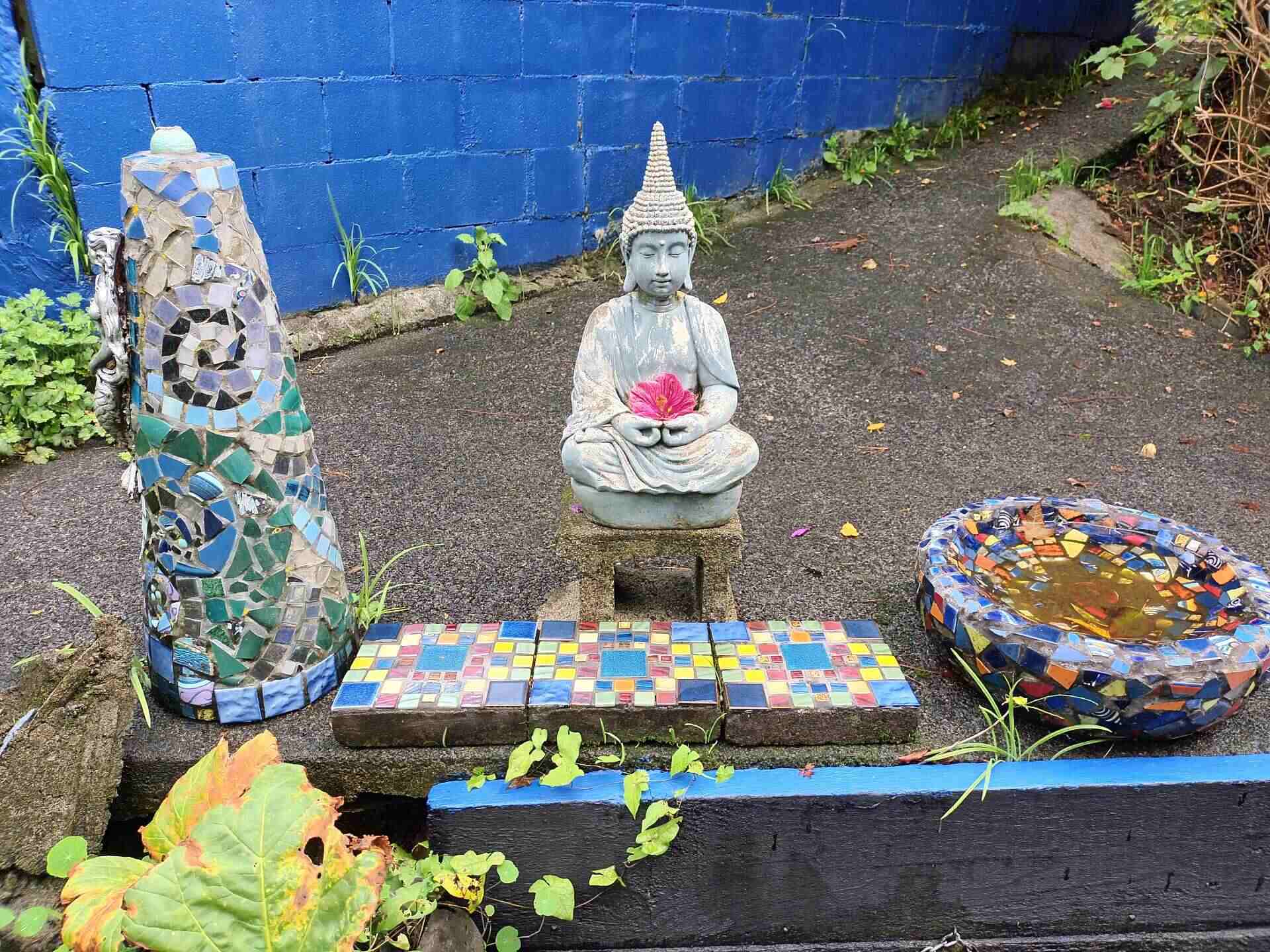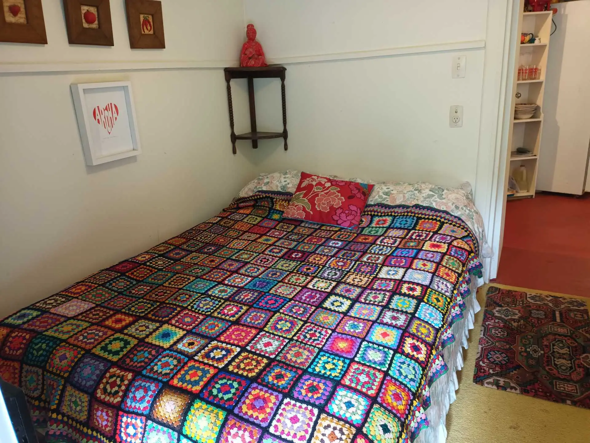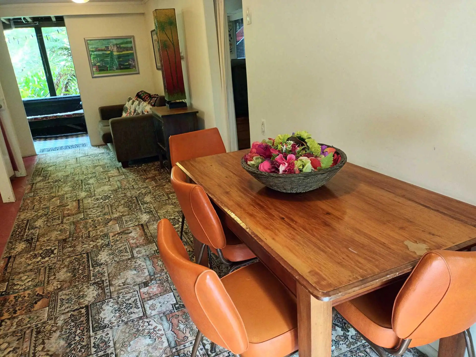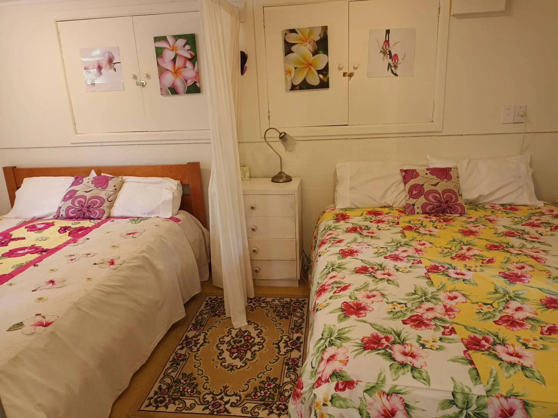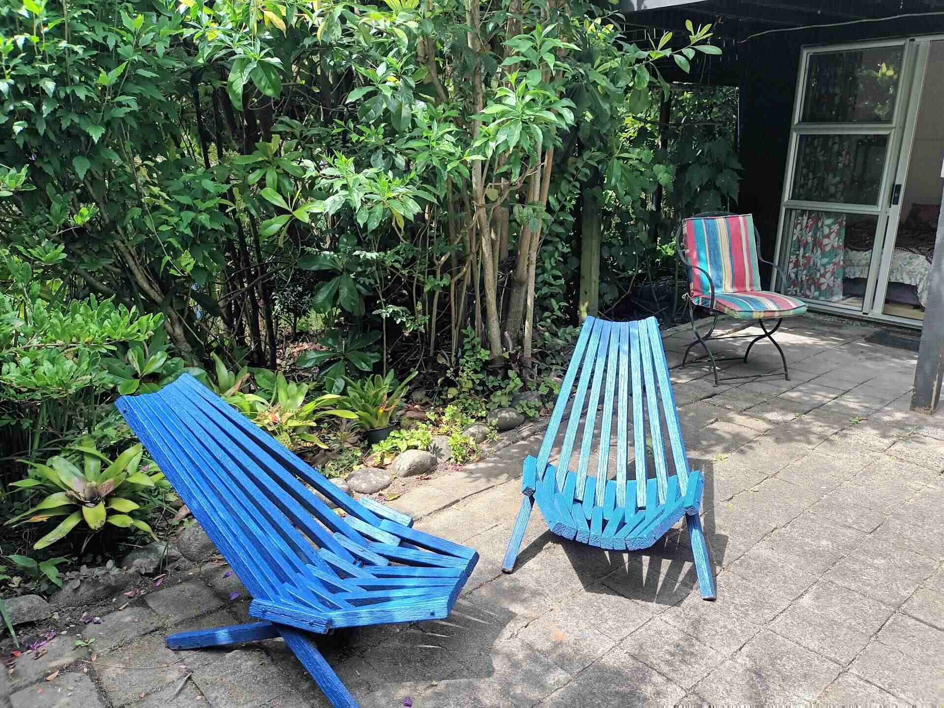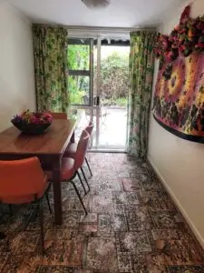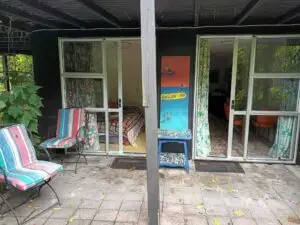 This comfortable and colourful apartment can sleep up to six people so suits a group, There are two queen beds in the large bedroom and a double bed in the small bedroom. Sliding doors open to a private courtyard.It is just an eight minute walk to town, but very private in a magical garden setting.