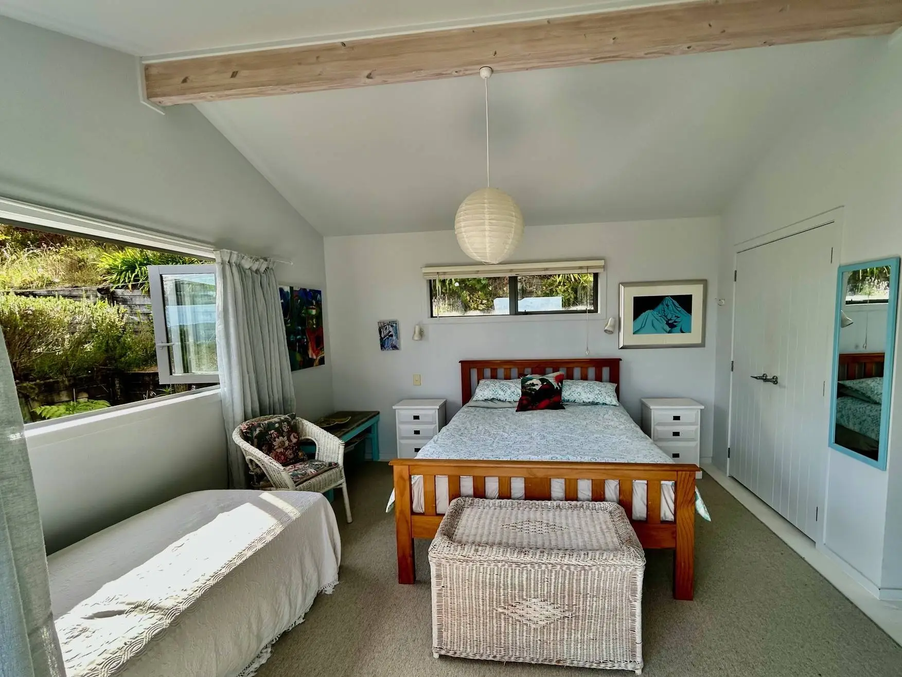 An artist’s hilltop retreat set in an acre of garden. Take a walk through the landscaped gardens, up to the viewing platform to enjoy a ‘sundowner’. You will feel far from the crowds but this enchanting location is only a short drive to Raglan village centre. Open plan living with doors folding out onto a wraparound deck with unsurpassed views of Mt Karioi, the ocean and farmland. Enjoy outdoor alfresco dinning with BBQ and brazier/fire pit. On cooler nights retreat indoors to the wood burner fireplace and heat pump/air conditioner. Two bedrooms, each configured with a queen and single bed. One bathroom and additional separate toilet. Normally only available to friends and family, this is a great opportunity to experience this private home and the Raglan way of life. Semi off-grid, this property operates on rainwater and a septic system, making it best suited to couples or smaller groups. It is connected to mains power and offers limited Wi-Fi. Any questions please don’t hesitate to contact me.
