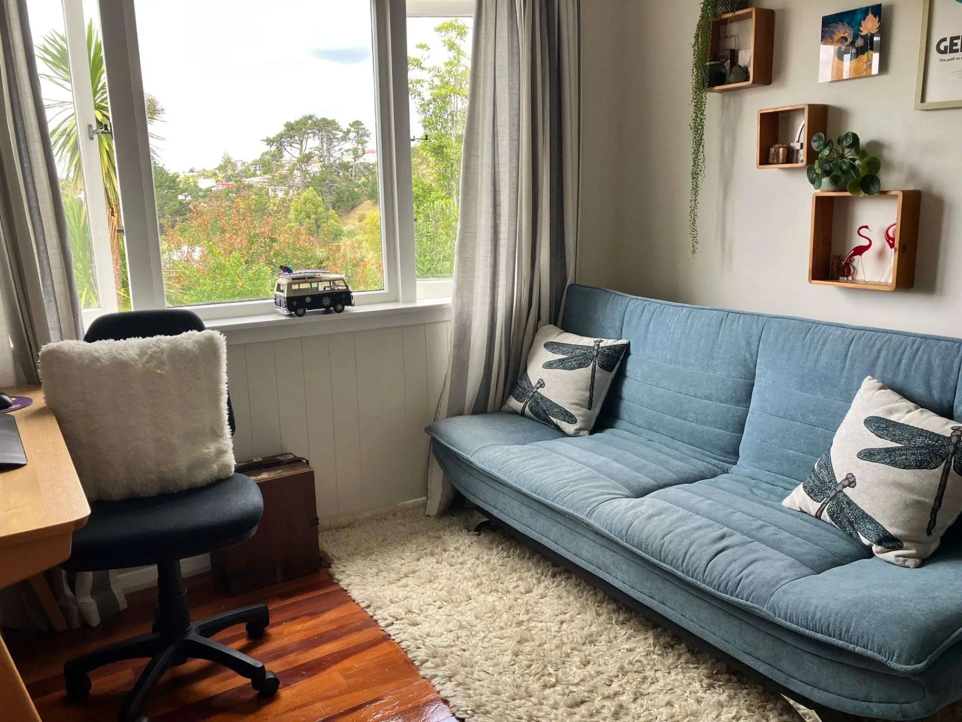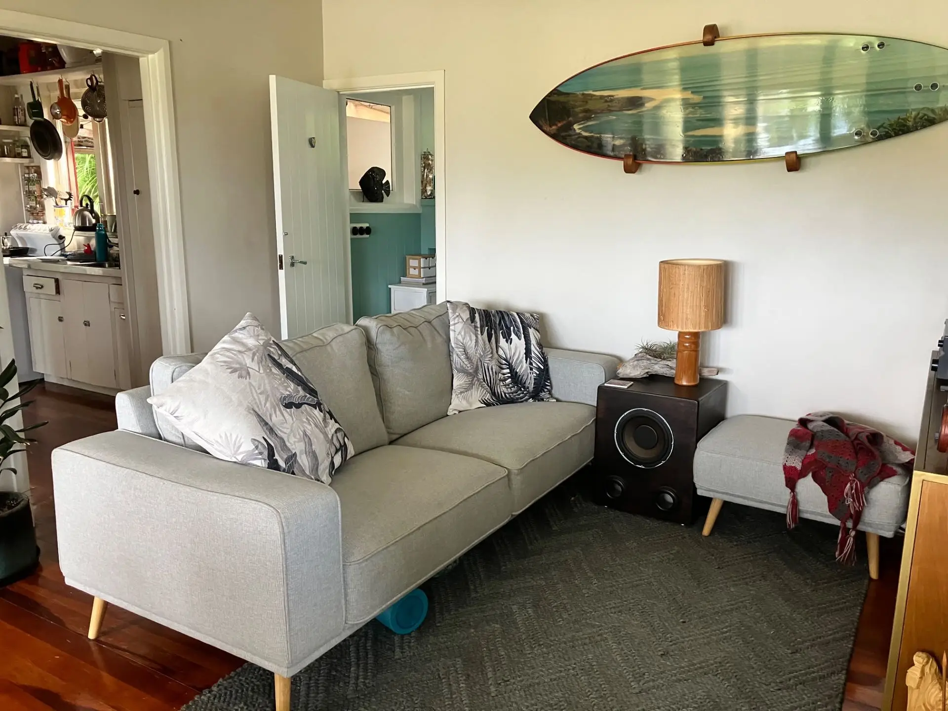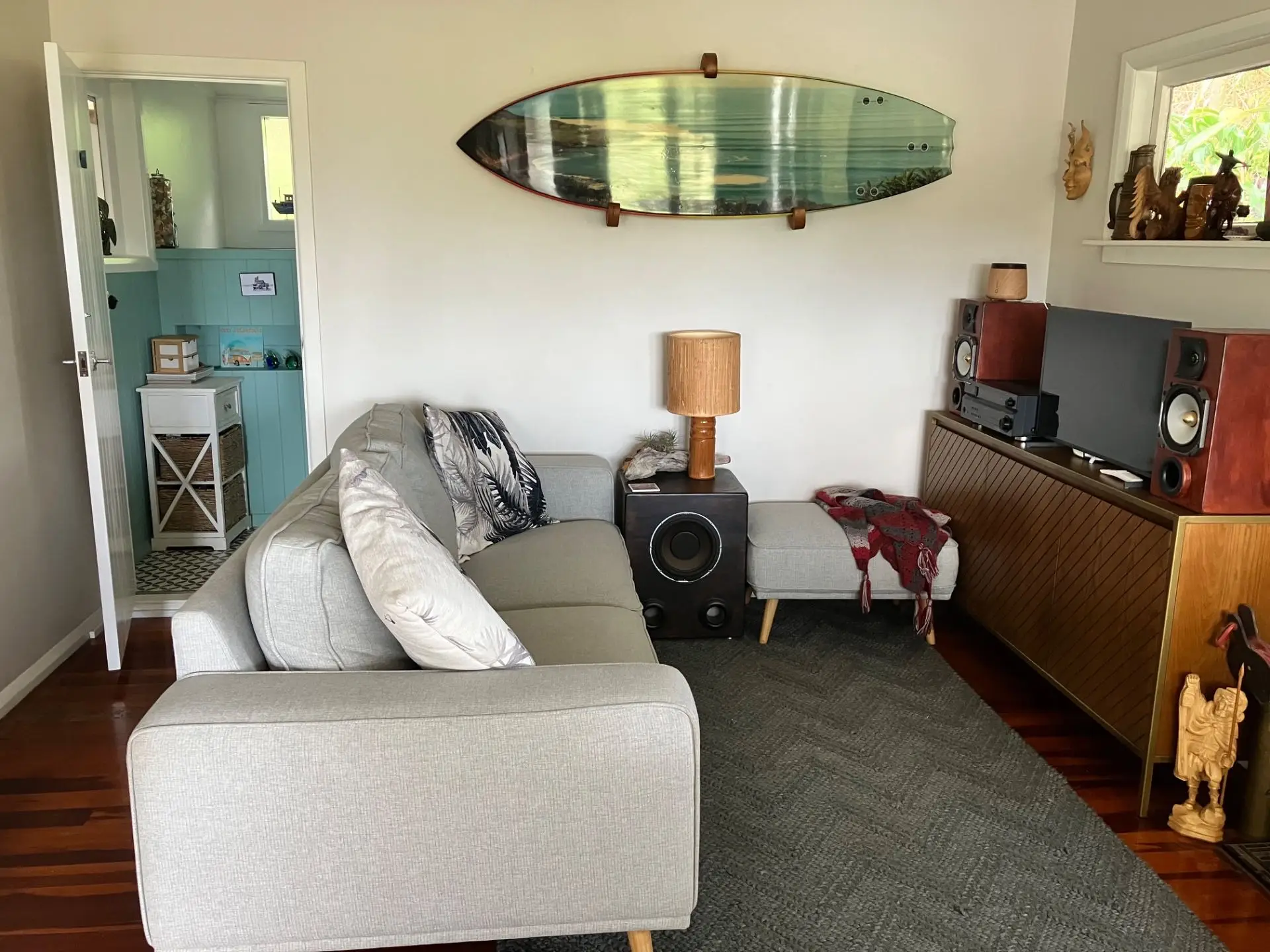 Welcome to our gorgeous, iconic Raglan cottage. Original 1930’s cottage with super cute features and everything you need for your stay during World Surf League May 26. Less than 10 mins walk to town to cafes, pub, connecting buses and shops. 10 mins walk to famous fish and chips at Raglan Wharf. Suitable for two adults +/- a child. (You can squeeze in two couples but it’s a small cottage and the second bed is a fold out)). Brand new sleepyhead queen bed in main bedroom that opens onto a sunny deck, perfect for morning coffee in the sun! Luxury spa. Beautiful easterly outlook and gardens.